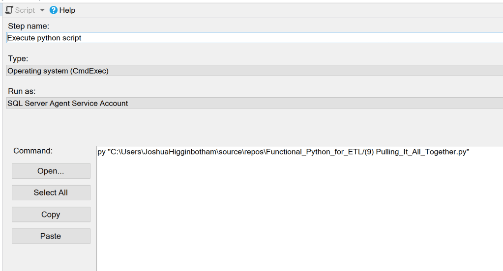 First of all, you don’t have to wait till you’re in the cloud to start using some of the languages or technologies you’ll find in the cloud. You can begin to work with languages like Python, while on-premises, to build your skillset and knowledge of the language ahead of time. Once in the cloud, you can hit the ground running. While this post will not cover what you need to learn, we will cover an important step to being able to work with Python while on-premises and that’s automation. There are a ton of ways that you can solve this issue. From open source solutions like AirFlow or Luigi, to native scheduling tools like Windows Task Scheduler or SQL Agent Jobs, we can set up scheduled runs of solutions. While AirFlow and Luigi are great options for what we are wanting to do, the spin up of the environments you’ll need to be able to use it takes time and effort that you may lack. You also have to add that to your list of systems you need to maintain, which doesn’t tend to make your support teams happy. If your end goal is to adopt the cloud, then my suggestion would be to use something we natively use each say as Developers within the SQL Server space.